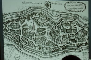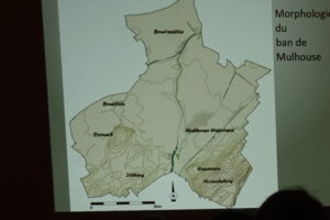 Avant de suivre le plan évoqué en liminaire, les conférenciers décrivent la morphologie de Mulhouse à ses origines, un peu avant le 13e siècle. La cité n’était qu’un petit noyau d’habitats, implanté au confluent de l’Ill et de la Doller, donc cerné par les eaux,…et souvent inondé car situé en creux de plaine et bordé par les dernières collines du Jura (l’actuel Rebberg).