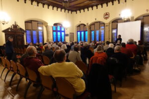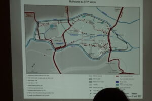 En introduction, les trois conférenciers rappellent que les matériaux structurant leur étude sur Mulhouse manquent tout particulièrement pour la période pré-1452, année où un incendie a ravagé les archives municipales, les détruisant quasi totalement. Les travaux ont donc été largement complétés par des examens sur le terrain. Par ailleurs, il leur a également fallu « tordre le cou » à quelques mythes tenaces.